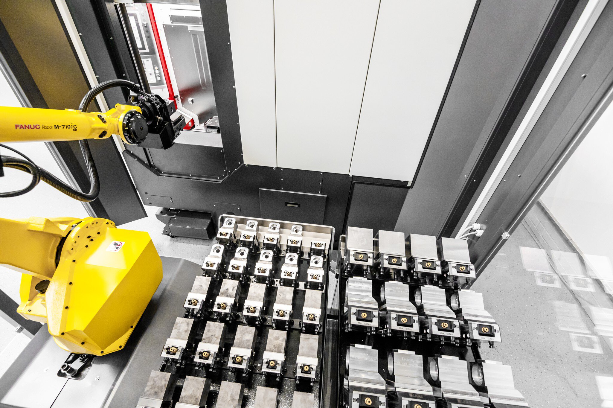 Die Automationszelle RoboTrex besteht aus einem Fanuc 6-Achs-Roboter mit Traglasten bis 50 kg. Die Speicherung der Werkstücke erfolgt mithilfe von Schraubstöcken auf mobilen Automationswagen. Die patentierte, hochkantige Lagerung der Schraubstöcke sorgt für eine optimierte Ausnutzung der Stellfläche. Die Automationswagen erlauben ein Auf- und Abspannen von Werkstücken auch in großer räumlicher Entfernung von der Maschine. Während des Betriebs der Maschine kann ein Automationswagen entnommen oder getauscht werden. Die RoboTrex 96 Anlage verfügt  zusätzlich über einen Greiferwechsel, um unterschiedliche Schaubstockgrößen abarbeiten zu können. In Verbindung mit der automatischen Erkennung der Automationswagen bietet die Anlage eine hohe Flexibilität und deckt eine große Teilevielfalt ab.