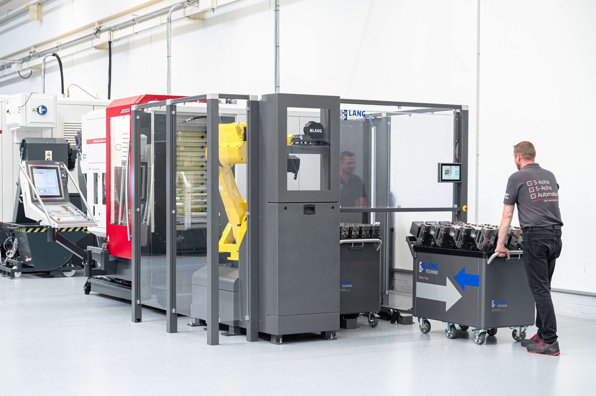 Werkstückautomation Lang RoboTrex - Bediener mit Werkstückwagen und Schraubstöcken