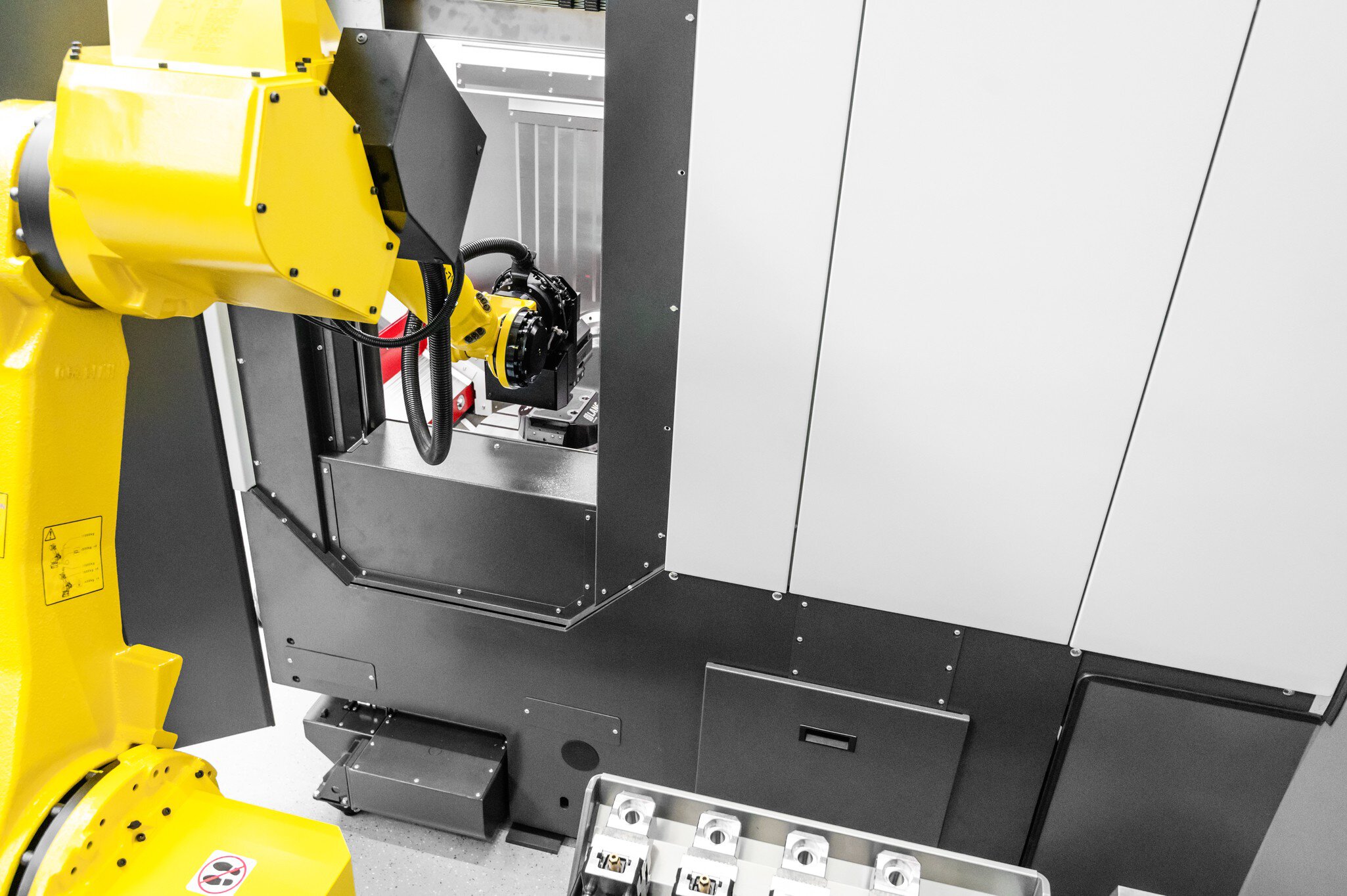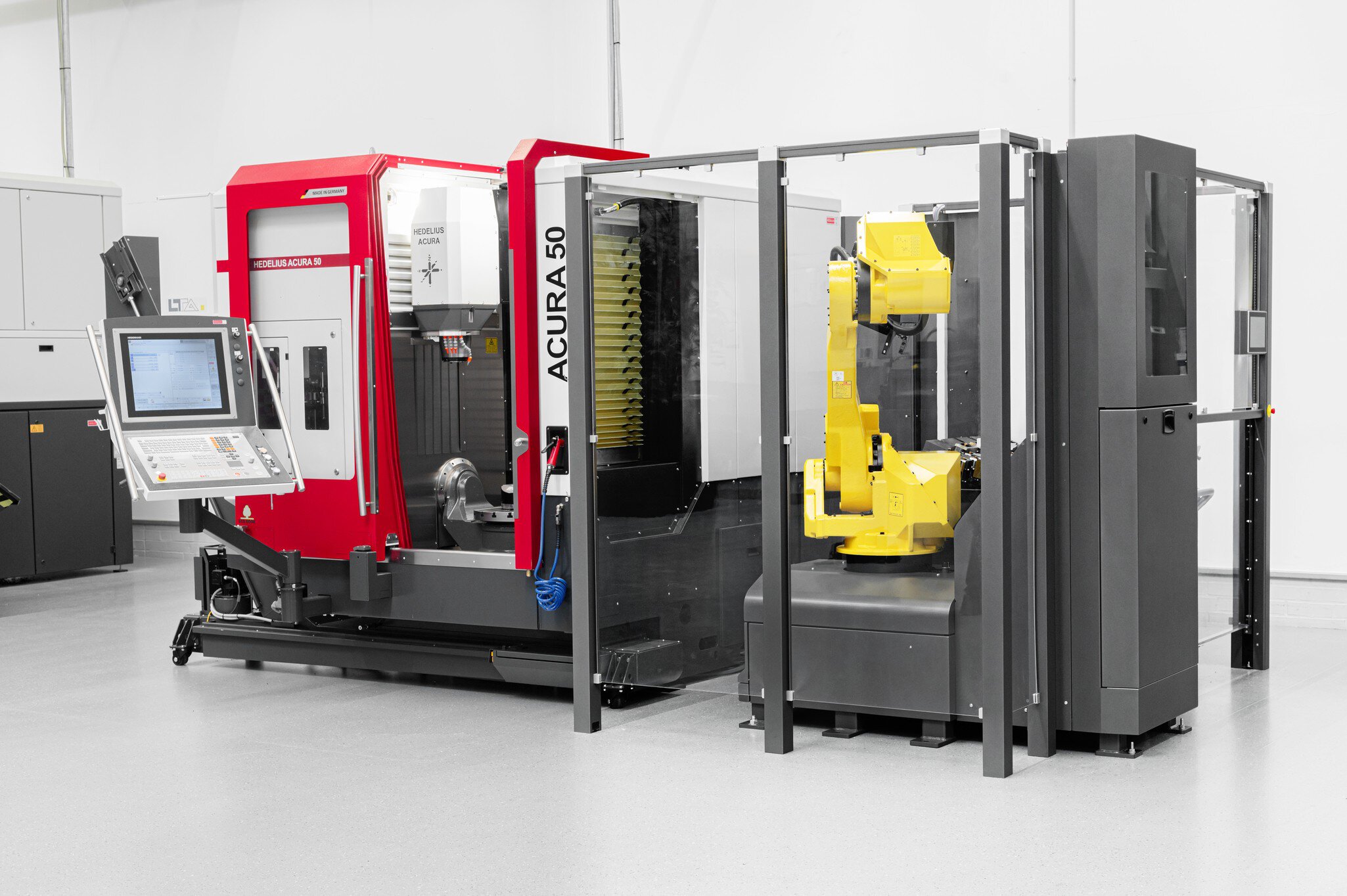 Das HEDELIUS Bearbeitungszentrum ACURA 50 mit der Automationszelle RoboTrex von Lang. Der Fanuc 6-Achs-Roboter ermöglicht die Bearbeitung mehrerer Produktionsserien in einem Produktionslauf.