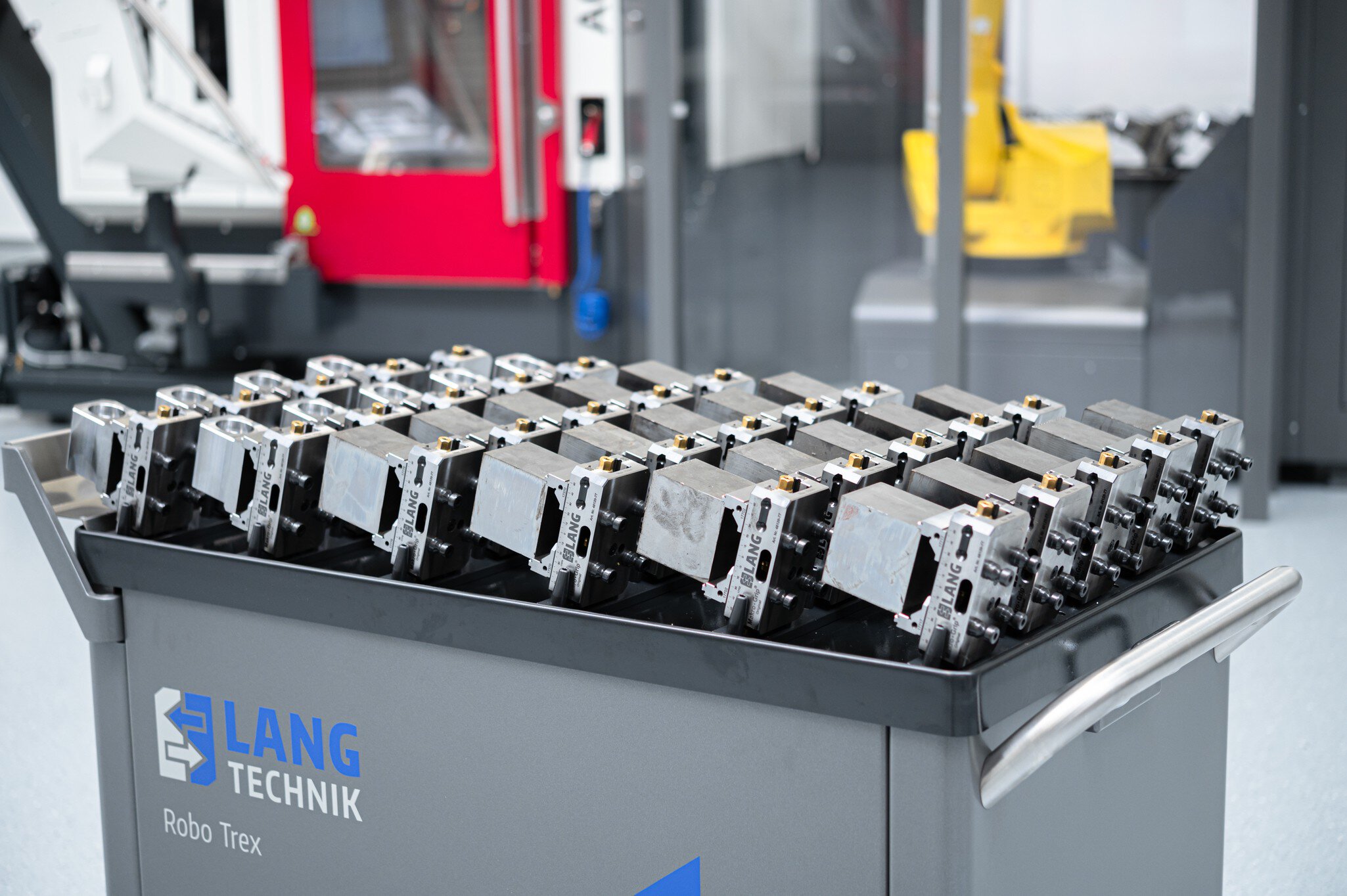 Werkstückautomation Lang RoboTrex - Werkstückwagen mit Schraubstöcken und eingespannten Werkstücken