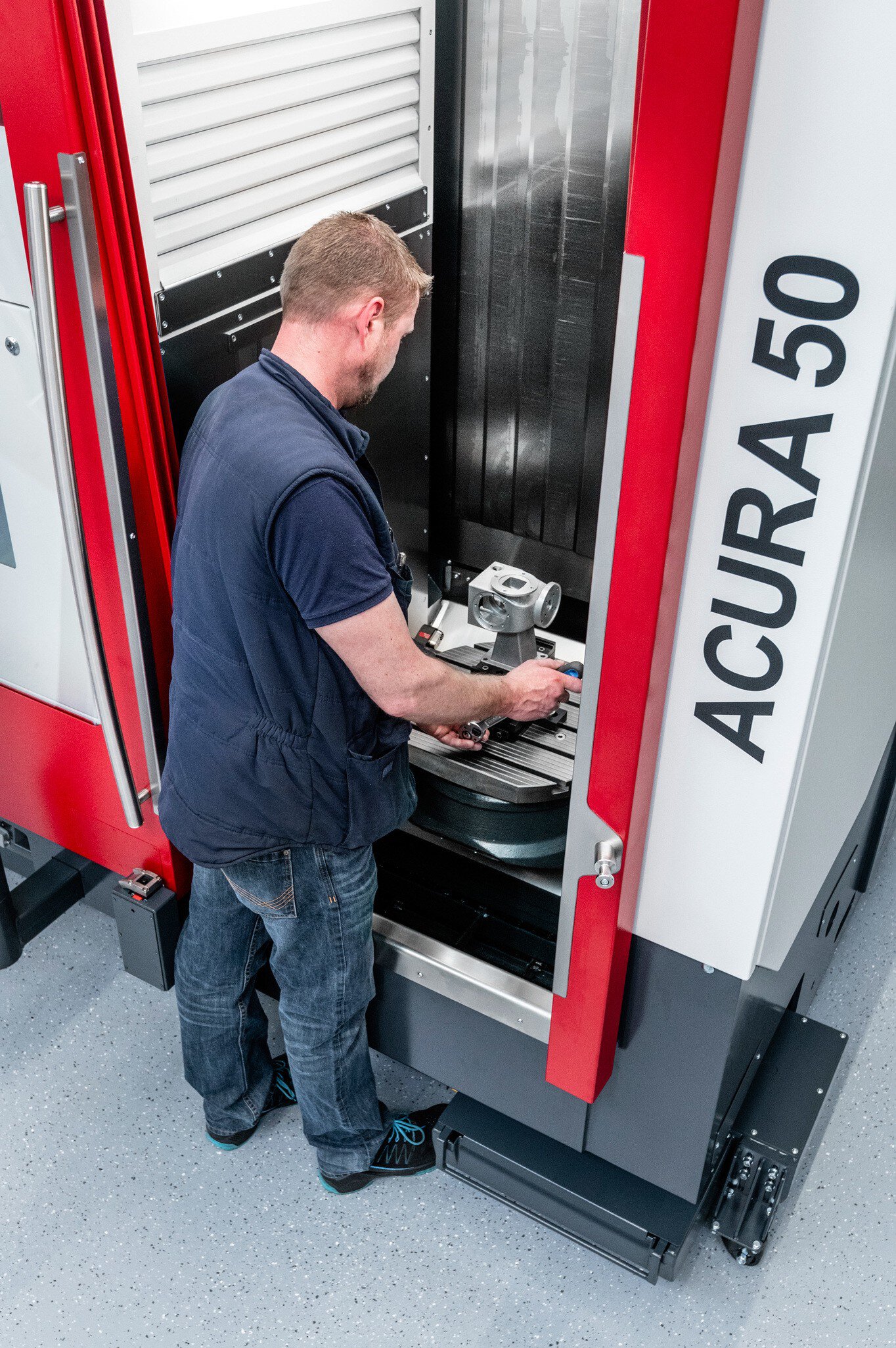 Die ACURA 50 bietet mehr Präzision auf weniger Stellfläche. Die konstant geführte Y-Achse in Verbindung mit den massiv verrippten Vorschubschlitten aus Grauguss vermindern Vibrationen. Der Dreh-Schwenktisch ist beidseitig gelagert und die Z-Achse ist speziell gegen Wärmeverzug geschützt. Diese und viele weitere Details erhöhen die Qualität der Bearbeitung, gleichzeitig fallen die Abmessungen des 5-Achs-Bearbeitungszentrums durch die besondere Bauweise äußerst gering aus.