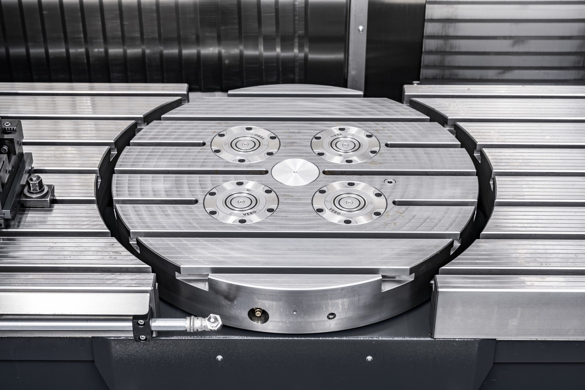 Všechna obráběcí centra HEDELIUS mohou být vybavena upínacími systémy GARANT ZeroClamp nebo SCHUNK NSE. Upínací systémy se instalují v jedné rovině s pevným stolem stroje, integrovaným otočným stolem nebo otočným otočným stolem, takže dráha pohybu není omezena. Upínací systém s nulovým bodem přesvědčí vysokou přídržnou silou a opakovanou přesností. K dispozici jsou také přídavné T-drážky pro použití klasických upínacích zařízení.
