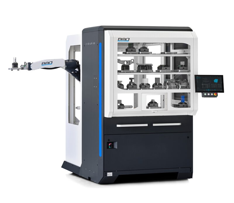 The Iridium Hybrid from BMO combines two worlds in the automation of a CNC machining centre: flexible automation of small series using devices with pallets and series production of e.g. sawing sections by inserting workpieces directly into the machine. The Iridium impresses on the one hand with its compact dimensions of just 1,500 mm in width and on the other with a capacity of 20 pallets measuring 200 x 200 mm and a storage drawer for 50 workpieces measuring up to 100 x 100 mm.