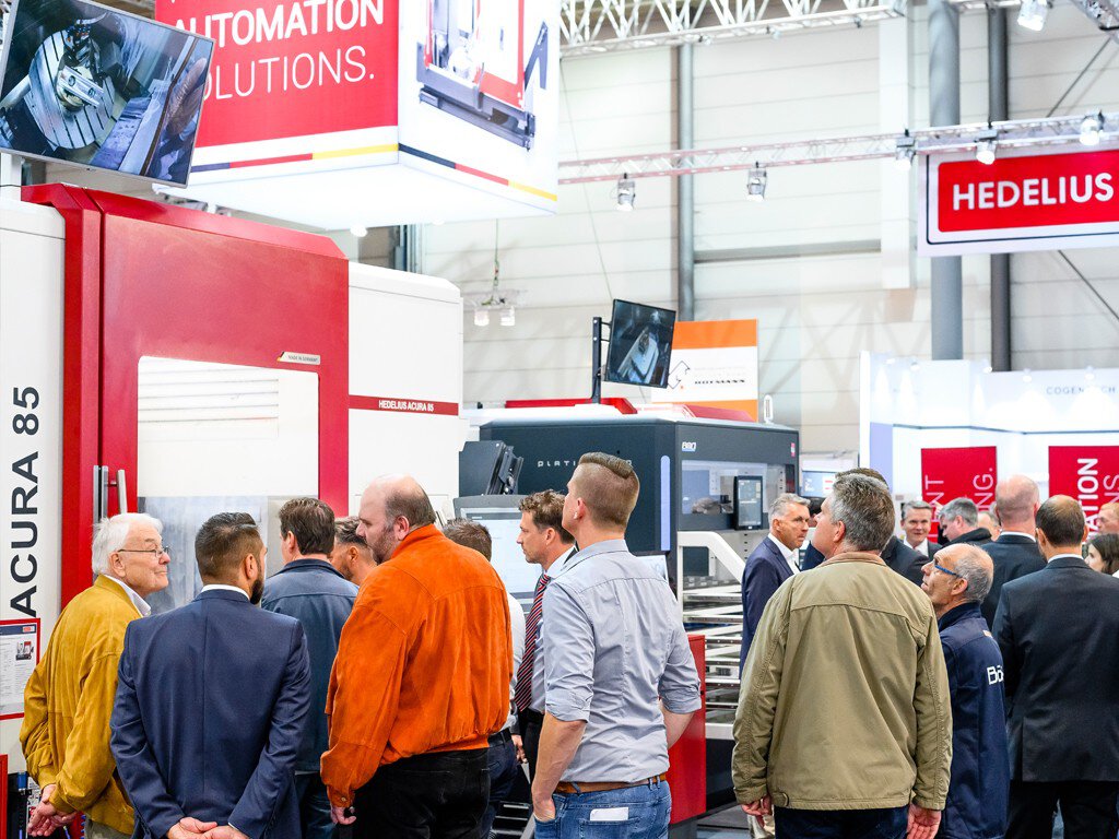 Despite the great interest in automation solutions, the swivelling head machines of the TILTENTA series continued to be the focus of visitors. The TILTENTA 7-2600 could be seen live under chip removal, and the new, integrated fast rotary table with speeds of up to 50 min-1 met with particular interest. Many visitors were also impressed by the wide range of machining options offered by the TILTENTA 7-2600, but especially by the TILTENTA 9-2600. 2600 x 900 x 900 mm (x/y/z) travel paths and a 1250 mm interference circle of the integrated rotary table enable combined 5-axis and long bed machining. This flexibility makes the HEDELIUS swivelling head machining centres particularly valuable for mechanical engineering, contract manufacturing, special machine construction and many other industries.
