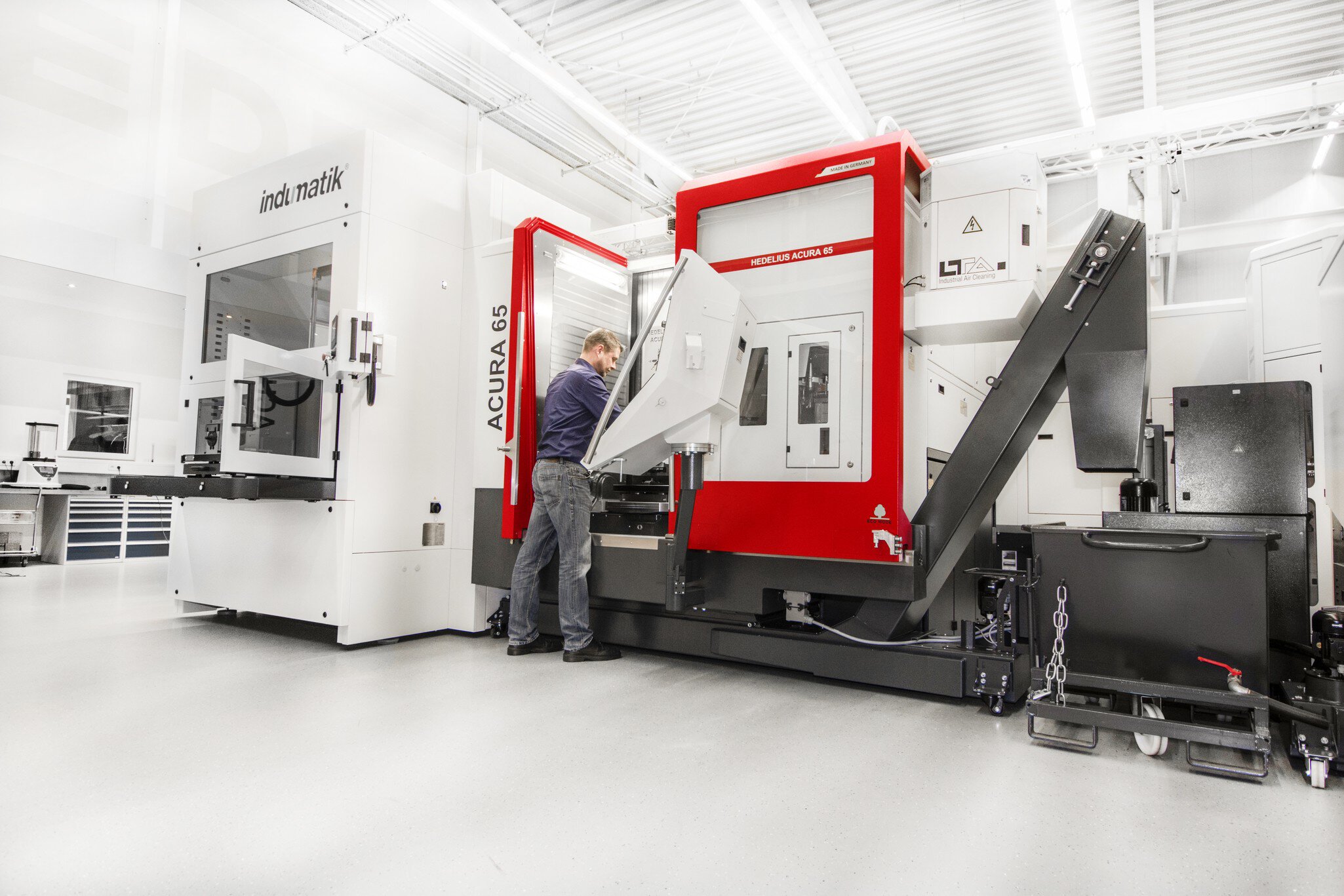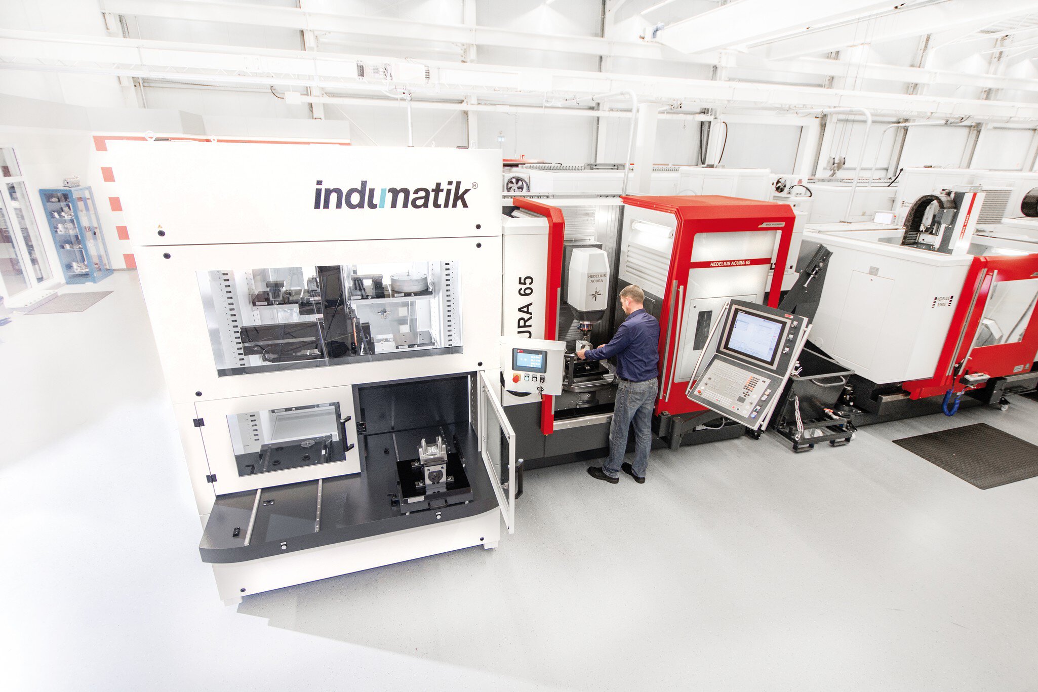 Avec l'INDUMATIK Light 120, le centre d'usinage peut passer rapidement et facilement du mode manuel au mode automatisé. Avec par exemple 30 Emplacements de palette pour différentes Pièces à usiner, l'HEDELIUS ACURA peut également être exploité en équipe sans opérateur. Grâce à la station de stockage et de déstockage intégrée, l'Opérateur peut à tout moment prélever des pièces finies et les équiper simultanément de nouvelles pièces. Le logiciel de pilotage optionnel InduCell vérifie les programmes CN et le tableau des outils afin de permettre un enlèvement de copeaux continu.