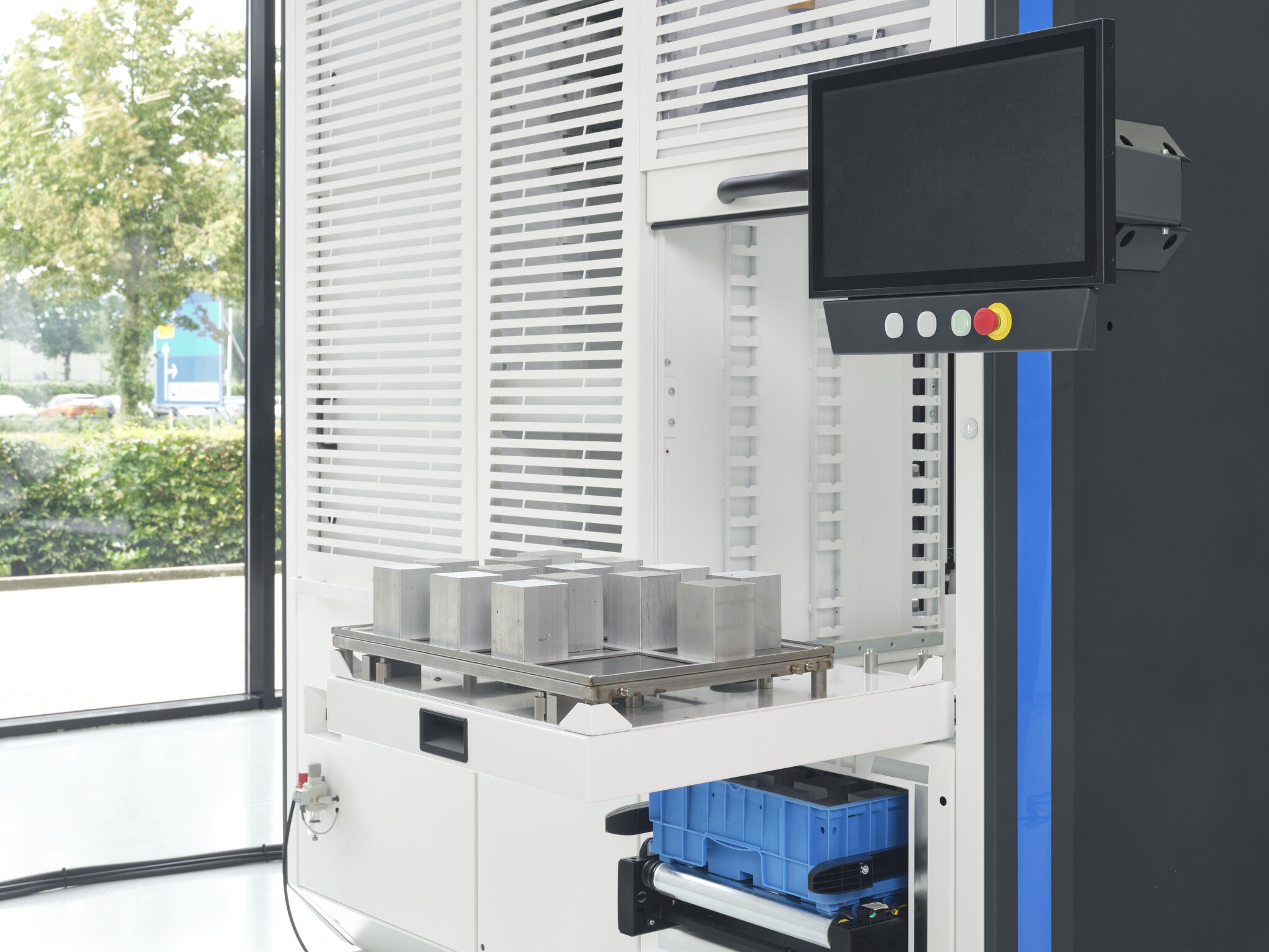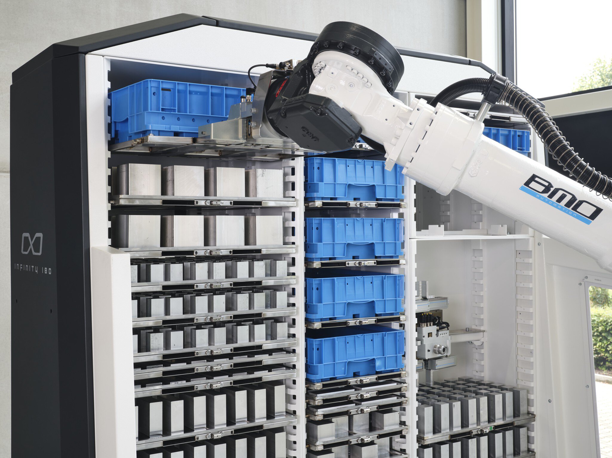 Míg a Platinum és Titanium sorozat robotcelláiban a feldolgozható munkadarabok számát a fiókok száma korlátozza, addig az Infinity sorozat robotcellái szinte korlátlan számú munkadarab és raklap befogadására képesek. Ezt a rugalmasan osztható polcok és a polckapacitás optimális kihasználását biztosító integrált magasságszabályozás teszi lehetővé. A munkadarabok tárolása rácsos tálcákon történik. Annak érdekében, hogy nagyon rugalmasan tudjon reagálni a kis tételméretekre, a nehéz alkatrészekre vagy az összetett befogási helyzetekre, az Infinity megoldás raklaphelyekkel rendelkezik a legkülönbözőbb befogási eszközök tárolására. Igazi többtételes automatizálásként a robot először automatikusan behelyezi a gépbe a szükséges befogóberendezést, majd a tálcákról a nyers alkatrészekkel együtt betölti a rögzítőt.