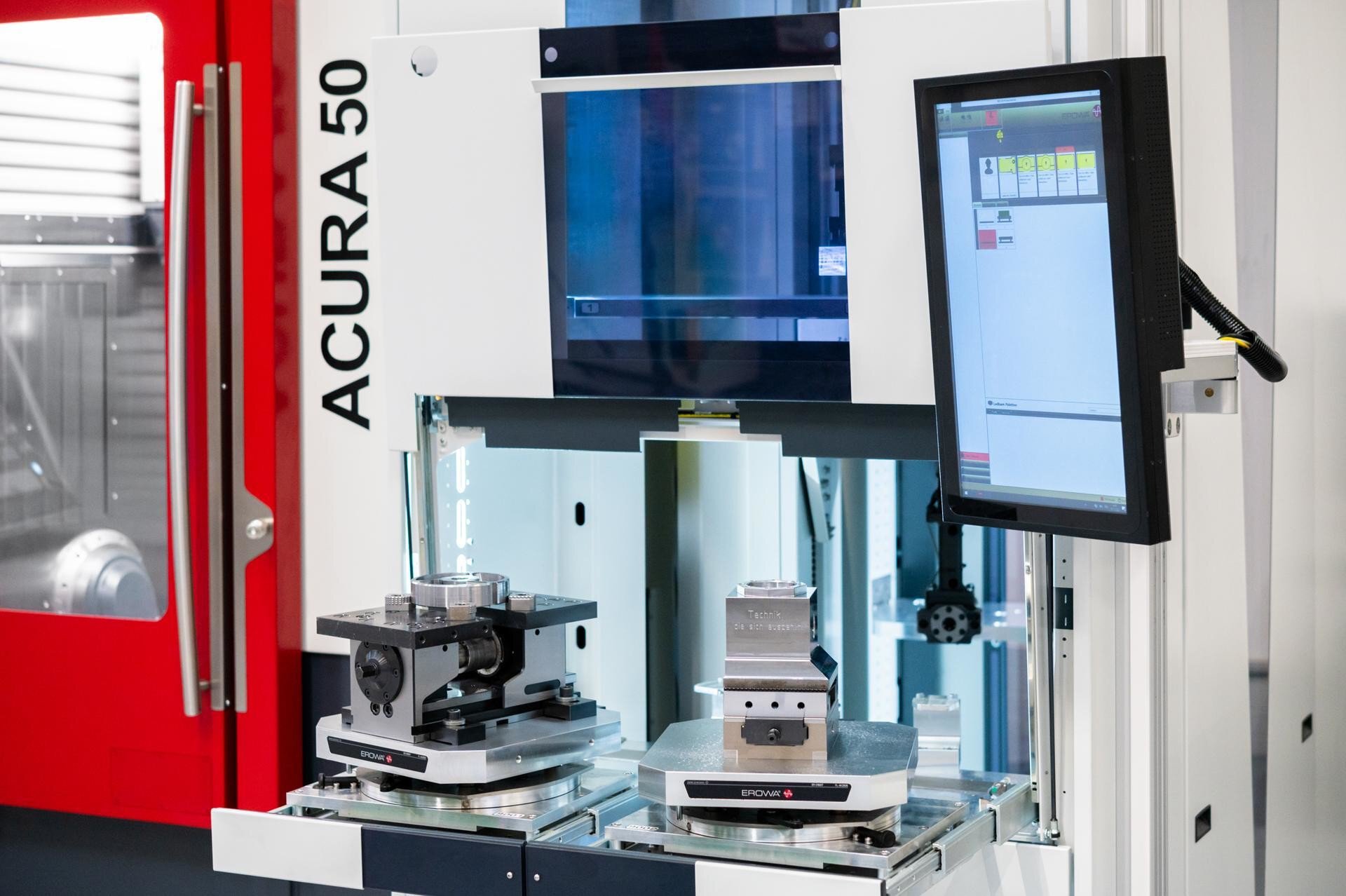 Lézeres rendszer a szerszámok mérésére és törésérzékelésre, felszerelve az ACURA 50 5 tengelyes megmunkálóközpont forgó-dönthető asztalára.