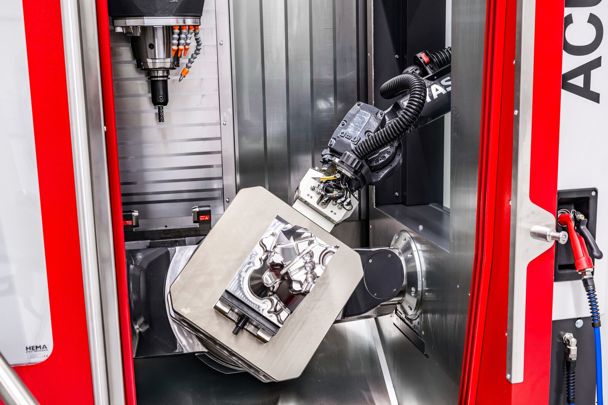Procesbesturing op het ACURA 5-assig bewerkingscentrum met draaiend venster. Schuifdeur uitgerust met draaiend venster.