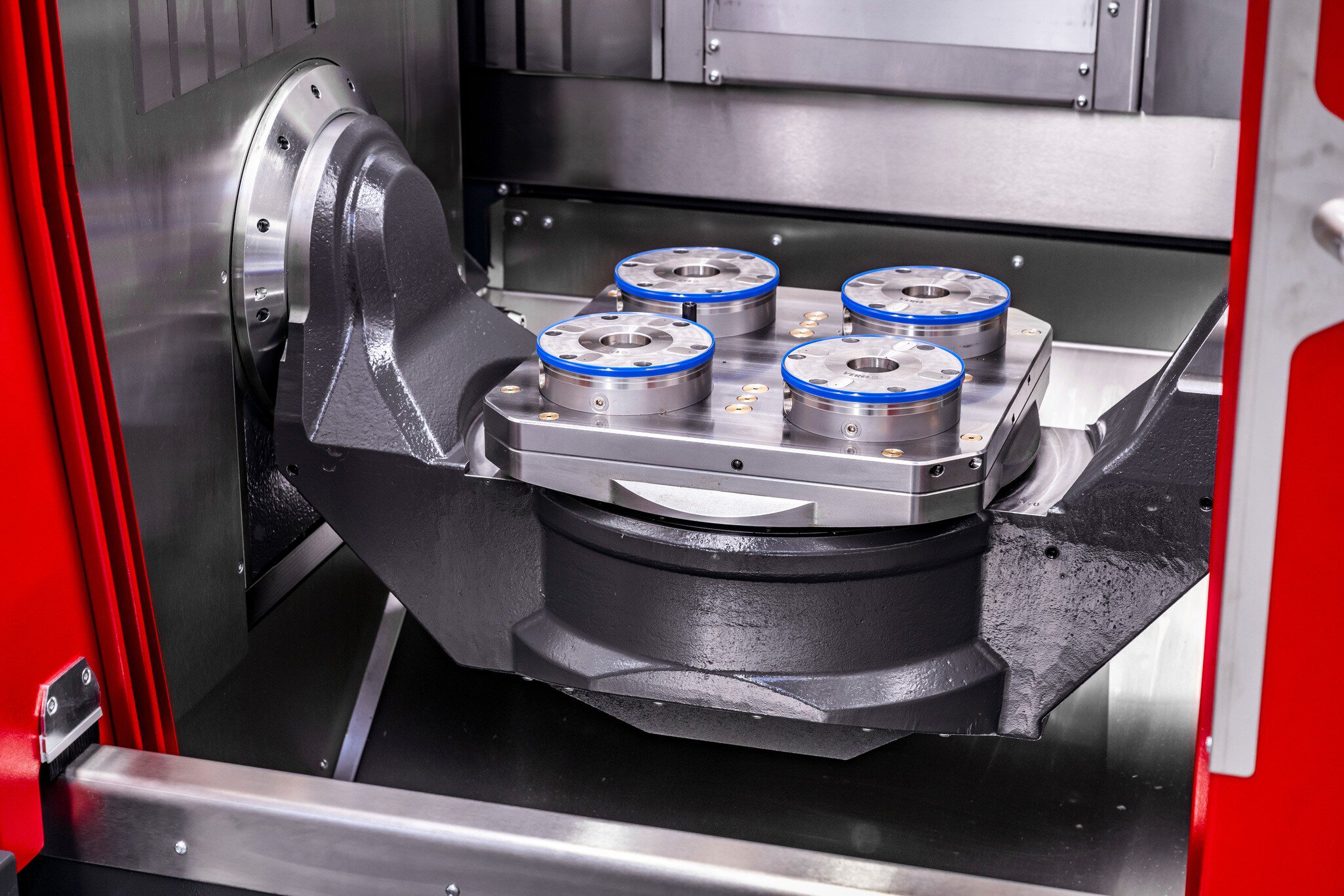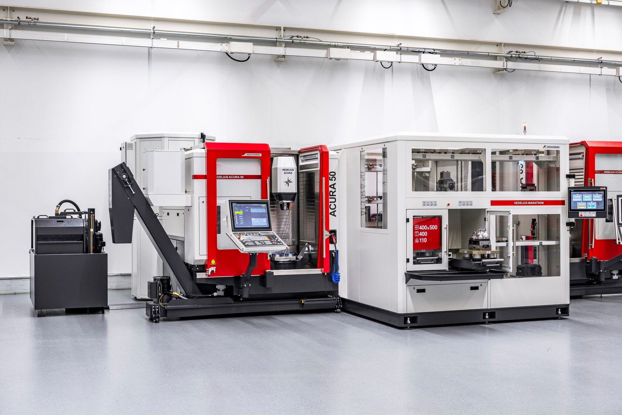 De ACURA 50 MARATHON is al voorbereid op palletautomatisering af fabriek met een vast geïnstalleerd Nulpuntspansysteem en een Pneumatiek bediende laadopening aan de rechterkant van de machine. Afhankelijk van de variatie van het werkstukspectrum zijn verschillende Gereedschapsmagazijnen met toe 319 gereedschapsposities en hoofdspillen tot 18.000 tpm beschikbaar.