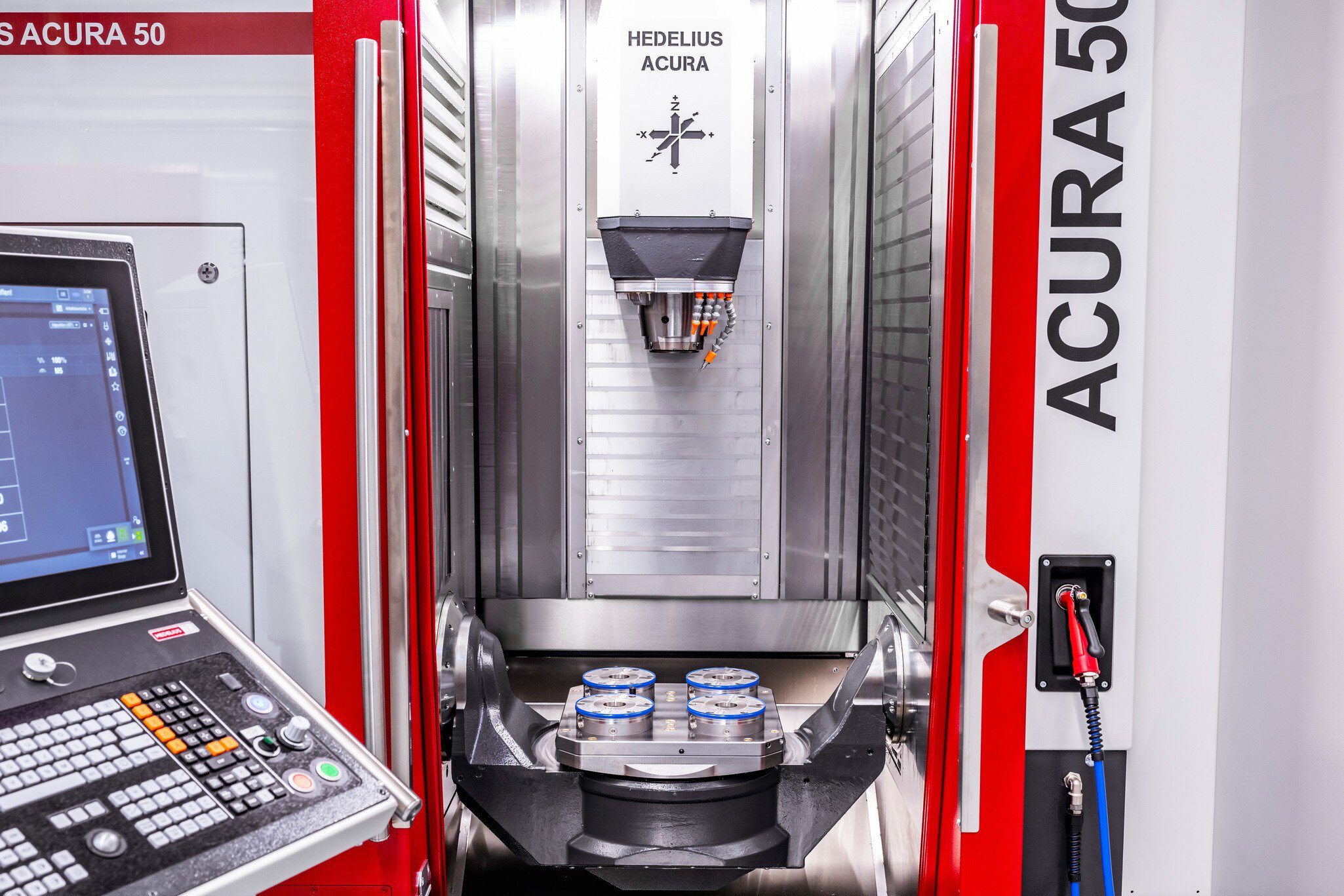 ACURA 5-assig bewerkingscentrum uitgerust met spoelpistool. Compleet met koelvloeistofpomp en houder.