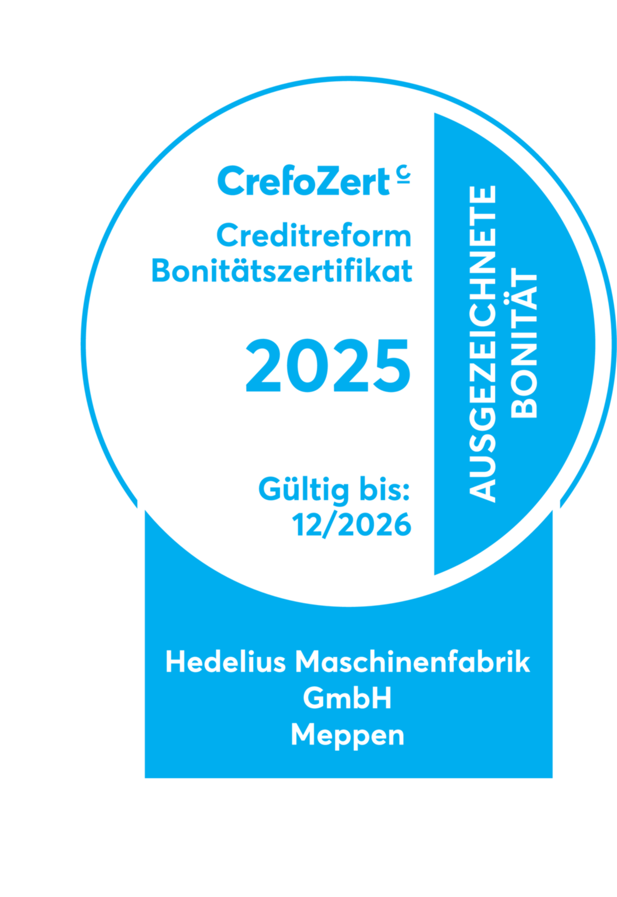 HEDELIUS Maschinenfabrik GmbH in Meppen heeft opnieuw het kredietwaardigheidscertificaat Creditreform CrefoZert ontvangen. Dit certificaat bevestigt opnieuw de uitstekende kredietwaardigheid van het bedrijf. Er wordt nog steeds volledig voldaan aan de strenge eisen voor de verlenging van de CrefoZert.
